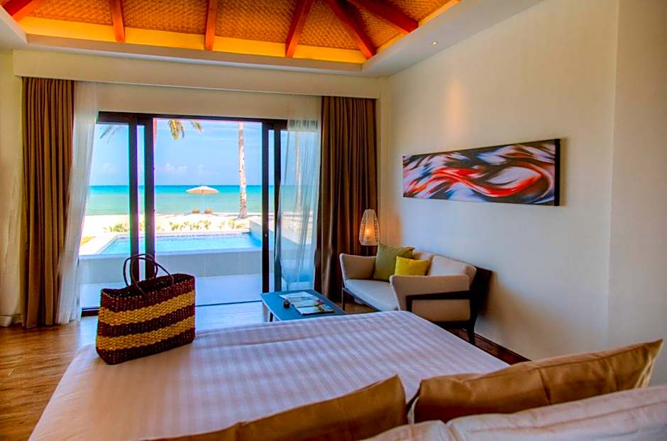 This Beach Villa with Private Pool features a private plunge pool with sun loungers, sea views and direct beach access, this larger villa is air-conditioned. It offers a sitting area with a flat-screen cable TV and a sofa. It also has a mini-bar with Nespresso coffee machine and tea making facility and wardrobe with iron and ironing board. The private bathroom is fitted with a bathtub and provides towels, hairdryer and complimentary bathroom amenities by Malin + Getz.